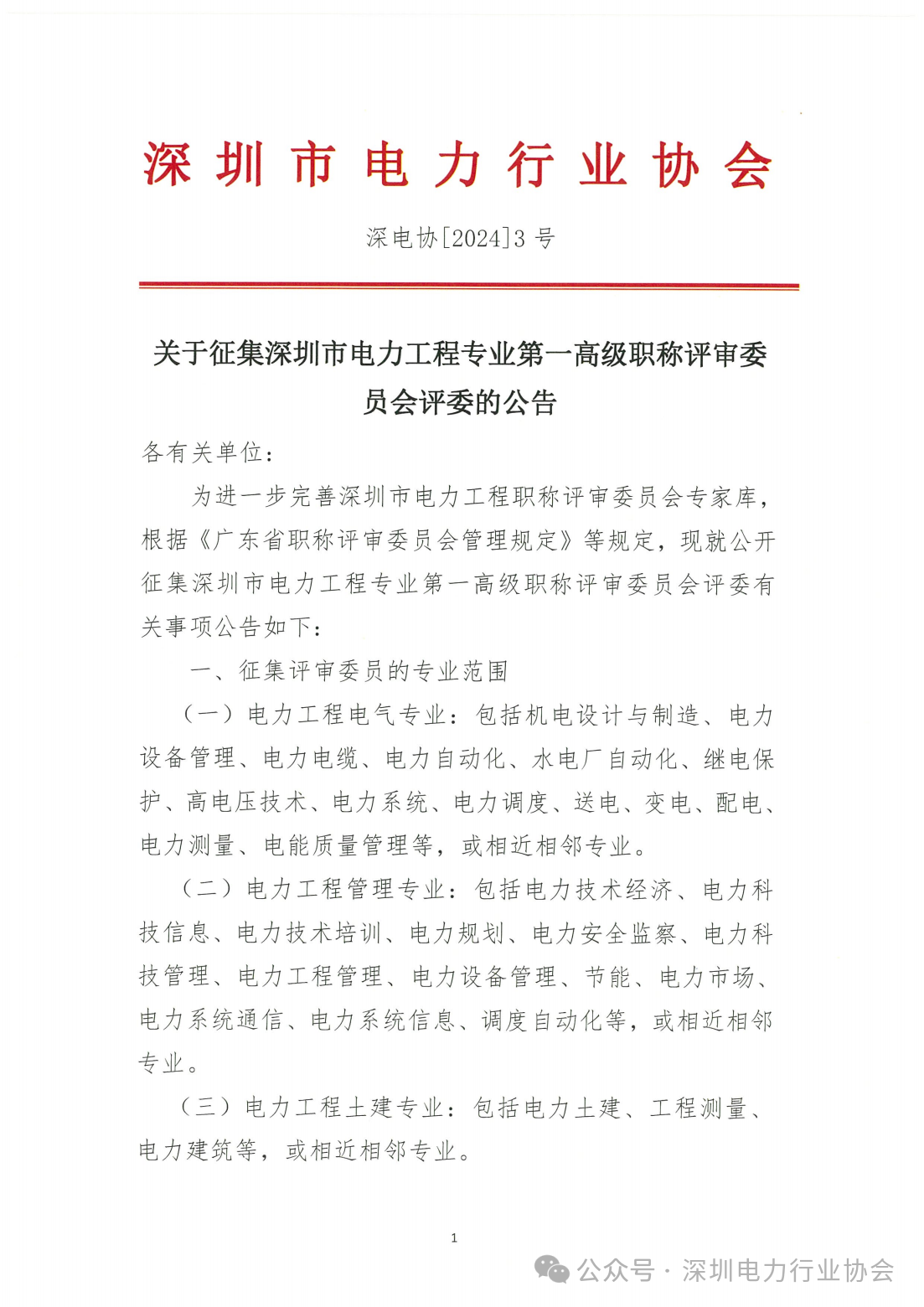 关于征集深圳市电力工程专业第一高级职称评审委员会评委的公告