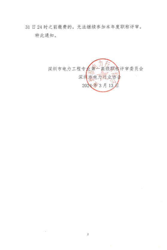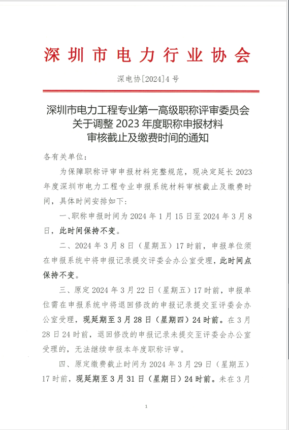 深圳市电力工程专业第一高级职称评审委员关于调整2023年度职称申报材料审核截止及缴费时间的通知