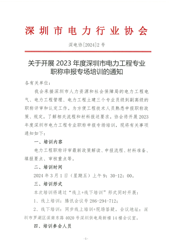关于开展2023年度深圳市电力工程专业职称申报专场培训的通知