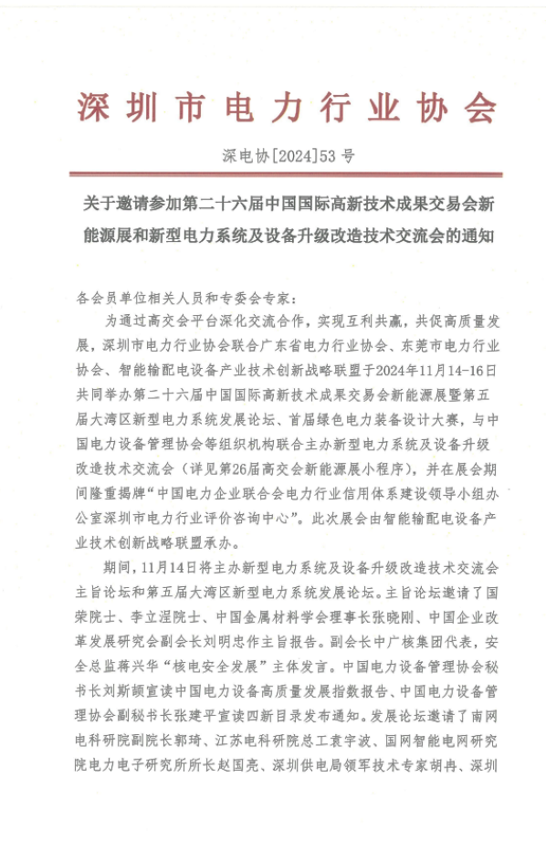 关于邀请参加第二十六届中国国际高新技术成果交易会新能源展和新型电力系统及设备升级改造技术交流会的通知